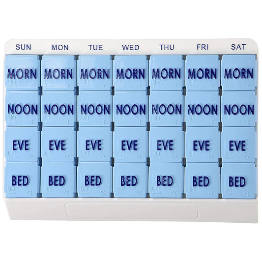 Pill Organizer 7 Day 4 Doses Per Day Easy Open Push Buttons Braille Markings